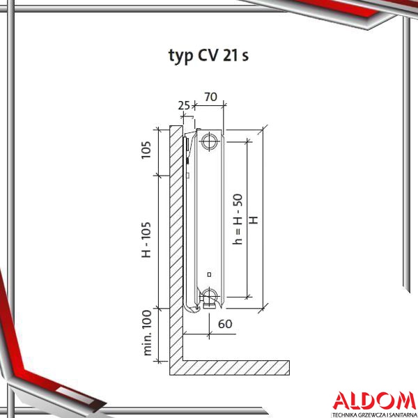 Grzejniki typu CV wyposażone są w cztery boczne i dwa dolne otwory przyłączeniowe z gwintem wewnętrznym ½″.