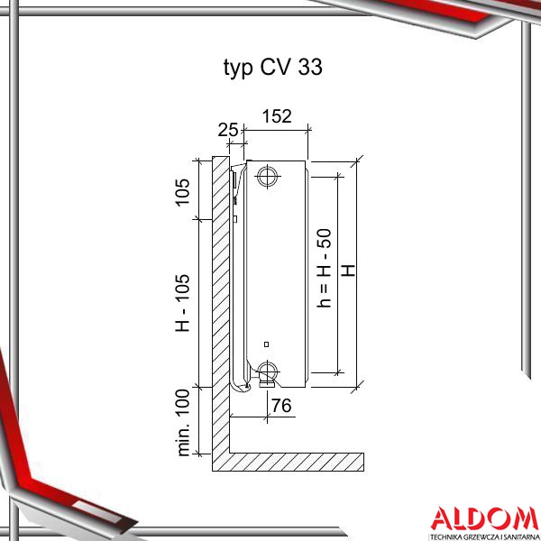 Grzejniki typu CV wyposażone są w cztery boczne i dwa dolne otwory przyłączeniowe z gwintem wewnętrznym ½″.